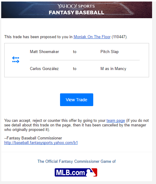 - Rival fantasy baseball owner Pitch Slap tried to trade me Carlos Gonzalez for Matt Shoemaker. When I countered with an offer for Matt Bush (the only non-Melancon closer) Pitch Slap said he didn't want to trade Bush for anything. I'm here to publicly shame him for disrespecting the Mancies.